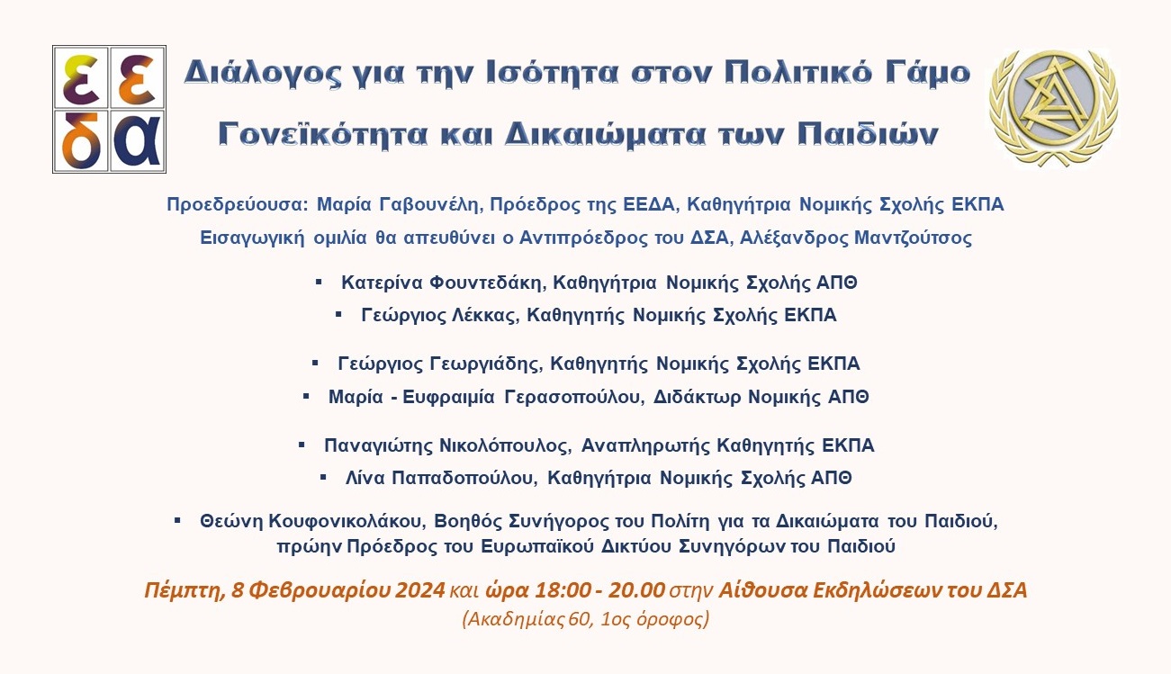 Η Εθνική Επιτροπή για τα Δικαιώματα του Ανθρώπου (ΕΕΔΑ) και ο Δικηγορικός Σύλλογος Αθηνών (ΔΣΑ) σας προσκαλούν στην επιστημονική ημερίδα που διοργανώνουν την Πέμπτη 8 Φεβρουαρίου 2024 και ώρα 18:00-20.00 στην Αίθουσα Εκδηλώσεων του ΔΣΑ (Ακαδημίας 60, 1ος όροφος) με θέμα: