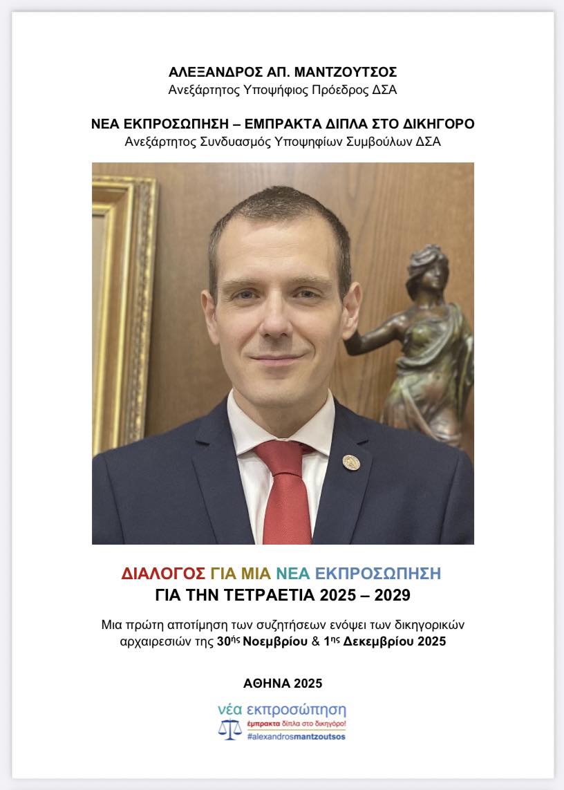 Ο «Διάλογος για την τετραετία 2025-2029», ο οποίος, αναρτήθηκε στην ιστοσελίδα μας https://ne2025.gr/dialogos/, τίθεται από σήμερα και για δύο εβδομάδες σε δημόσια διαβούλευση ώστε, αφού ληφθεί υπόψη η γνώμη όλων των ενδιαφερόμενων συναδέλφων, να οριστικοποιηθεί το «Προγραμματικό Πλαίσιο 2025-2029», το οποίο θα παρουσιαστεί σε ειδική εκδήλωση από κοινού με τους Υποψηφίους Συμβούλους του ανεξάρτητου συνδυασμού «Νέα Εκπροσώπηση – Έμπρακτα δίπλα στο Δικηγόρο».