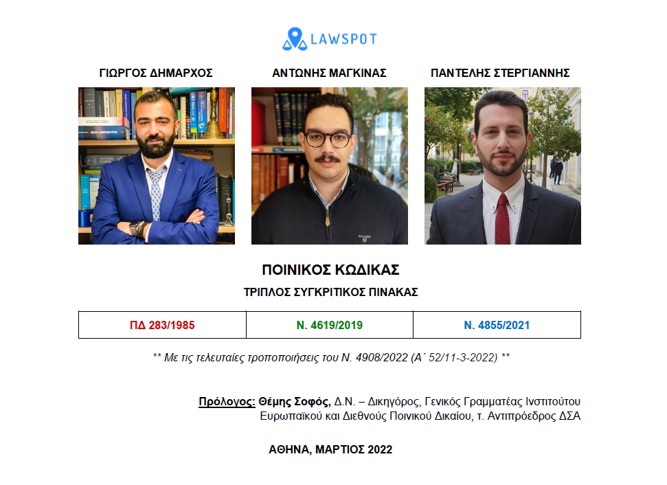 Αυτό το έργο του τριπλού συγκριτικού πίνακα χαρακτηρίζεται από επιμελή παράθεση των διατάξεων, όπως αυτές είχαν με τον Ποινικό Κώδικα του Ν. 4619/2019, και τροποποιήθηκαν με τους μεταγενέστερους νόμους (Ν. 4855/2021, Ν. 4908/2022): Επισκοπούνται και παρατίθενται μεταξύ άλλων ουσιώδεις τροποποιήσεις σε διατάξεις για την αναστολή εκτέλεσης της ποινής, την υφ΄όρον απόλυση, την κοινωφελή εργασία, επιμέτρηση συνολικής ποινής, αλλά και σημαντικές διατάξεις του ειδικού μέρους, όπως την εγκληματική οργάνωση, την διασπορά ψευδών ειδήσεων, την πλαστογραφία, απάτη, απιστία, τον εμπρησμό, την παραβίαση μέτρων για την προστασία της δημόσιας υγείας, τα εγκλήματα κατά της γενετήσιας ελευθερίας κ.ά.